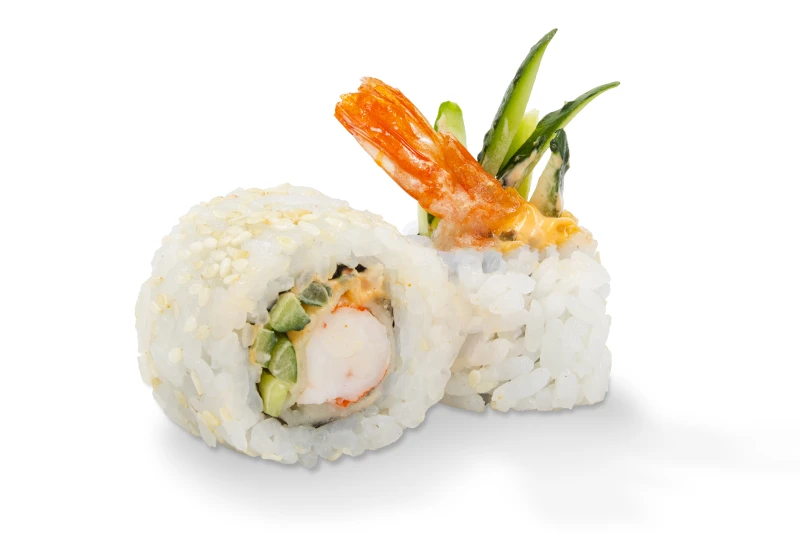 8 шт. Рис, креветка темпура, огурец свежий, соус спайси, кунжут, нори. В комплекте: соевый соус - 1, васаби - 1, имбирь - 1