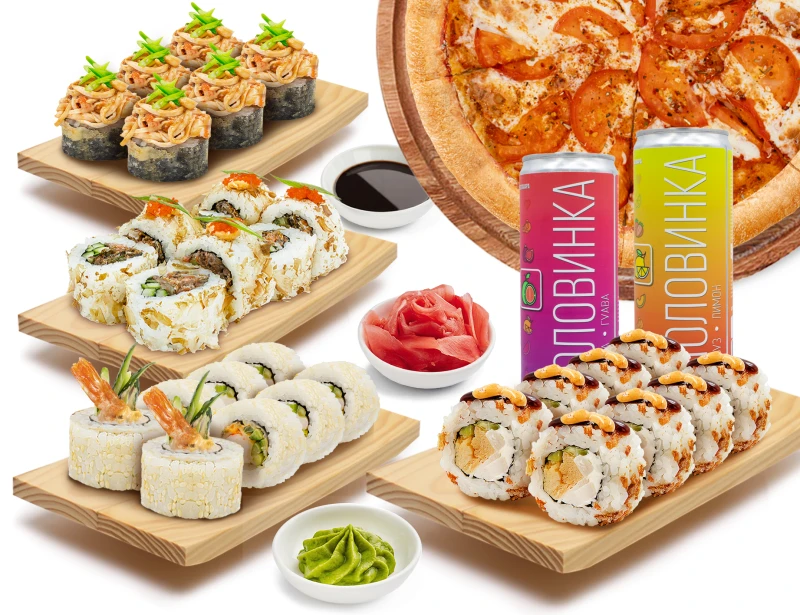 Комбо на 4 персоны Пицца 32 Маргарита; фирменные роллы: Краб темпура, Шаньнань; запечённые роллы: Креветка темпура, Ким ролл; напитки: Половинка Клубника Гуава, Арбуз Лимон В комплекте: соевый соус - 4, васаби - 4, имбирь - 4.