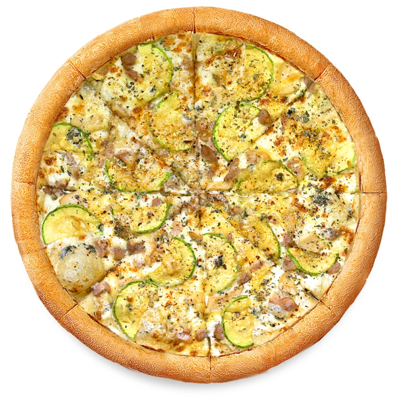 Сочное куриное бедрышко, маринованные грибы, ассорти нежных сыров: пармезан, моцарелла, сыр с голубой плесенью; белый соус, маринованный кабачок, орегано, традиционное тесто для пиццы *на фото демонстрационный вариант подачи