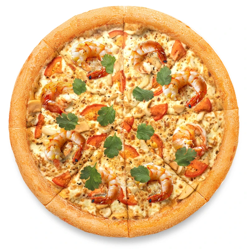 Сочные креветка и кальмар, маринованные грибы, свежие помидоры, нежный сыр моцарелла, кинза, пряная мамида, соус Том Ям, свежая кинза, традиционное тесто для пиццы *на фото демонстрационный вариант подачи