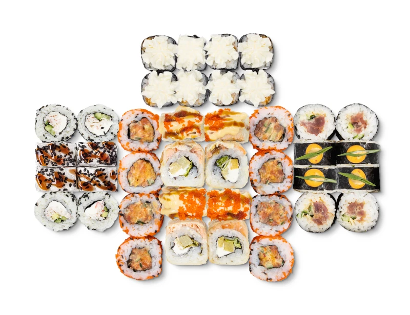 40 шт. Тунец спайси, Кранч с лососем, Ётун, Криспи лосось, Сливочный краб В комплекте: соевый соус - 2, васаби - 2, имбирь - 2