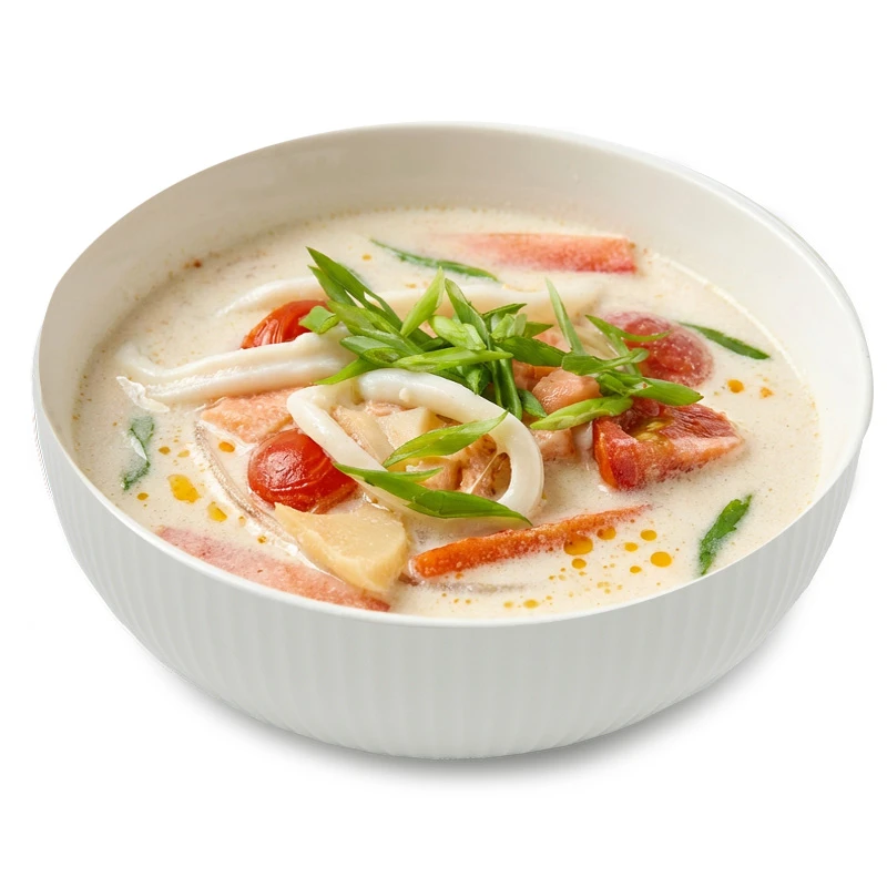 Сочное филе лосося, нежный кальмар, маринованные грибы, свежие помидоры черри, ароматный болгарский перец, сочный зеленый лук, насыщенный рыбный бульон *на фото демонстрационный вариант подачи