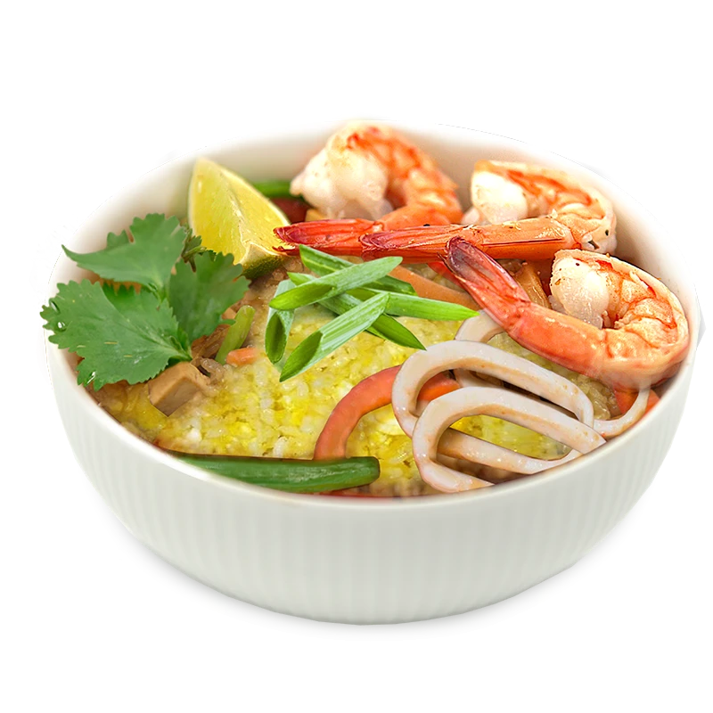 Тигровые креветки и кальмар, суши рис с яйцом, соус том ям, овощи аль денте (морковка, кабачок, лук репчатый, перец болгарский), свежий зеленый лук, имбирно-чесночный микс, кинза, белый кунжут, долька свежего лайма *на фото демонстрационный вариант подачи